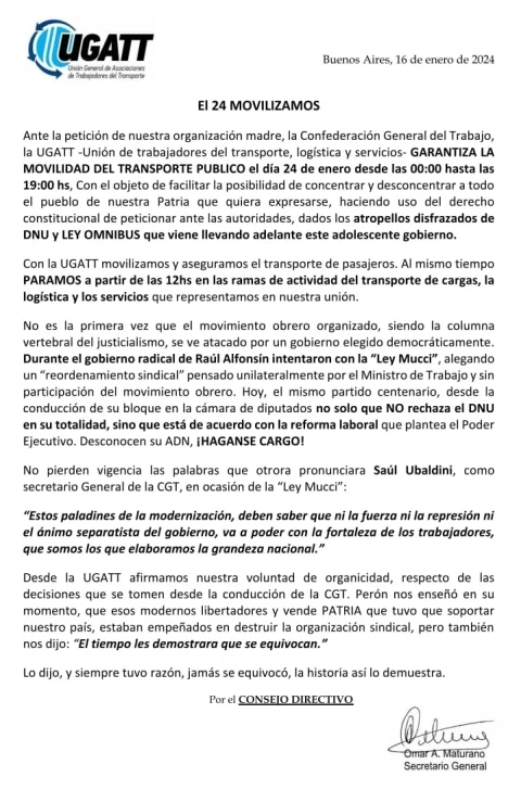 El próximo 24 de enero la Confederación General de Trabajadores (CGT) lanzó un paro general nacional en contra de la ley omnibus del gobierno de Milei. La UTA Rosario informó que se acoplarán a la medida de fuerza, con la particularidad de que cumplirán con los servicios hasta las 19 horas para garantizar la llegada y salida de los actos y posteriormente se cancelarán los recorridos hasta la medianoche. Esta modalidad también se replicará en la ciudad de Santa Fe.