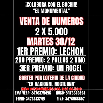 Para lograrlo, los organizadores lanzaron una gran rifa solidaria con premios bien criollos: 1° premio: Un lechón. 2° premio: Dos pollos y dos vinos. 3° premio: Un rogel. El sorteo será el 30 de diciembre por la Lotería de la Ciudad (ex Nacional Nocturna). Los números cuestan 2 por $5.000 y se pueden conseguir contactando a Ema (3476375496), Hugo (3476640893), Perri (3476613745) o Pina (3476566807).
