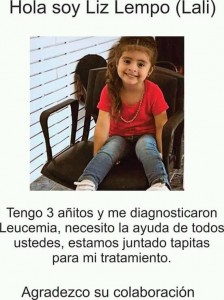 Liz Lempo (Lali) es una niña de tres años, de Puerto General San Martín (PGSM), que lucha por su vida luego de que le diagnosticaran Leucemia. Como cuando se quiere, se puede, familiares y amigos de la pequeña organizaron una movida solidaria a través de las redes sociales para colaborar con lali y sus papás.